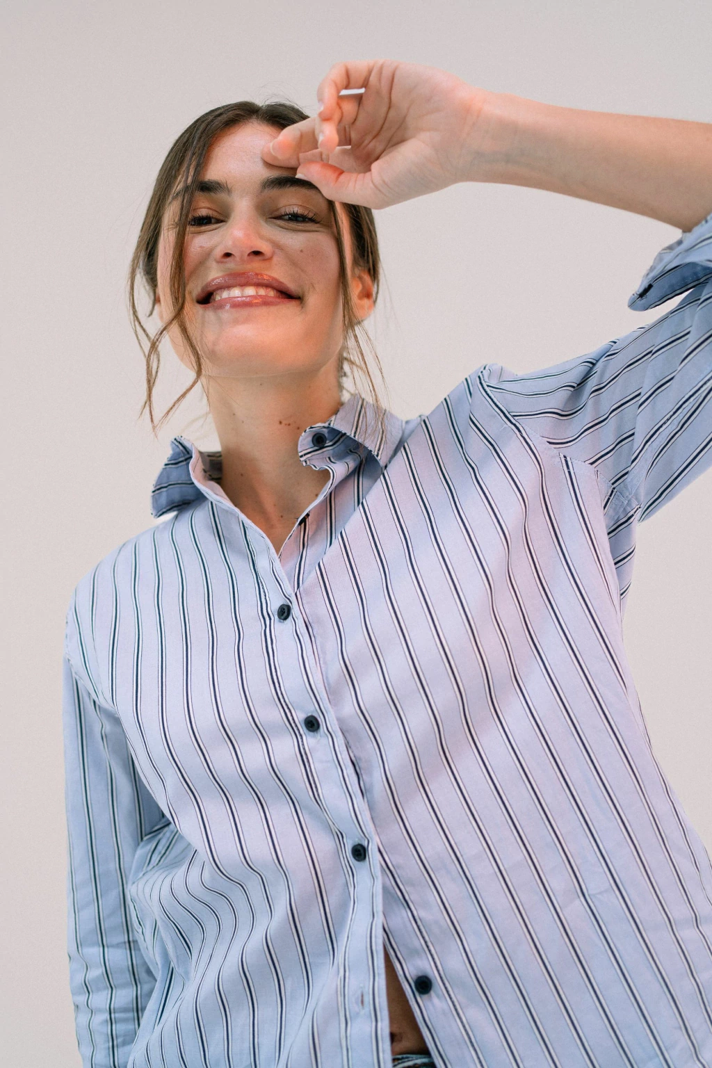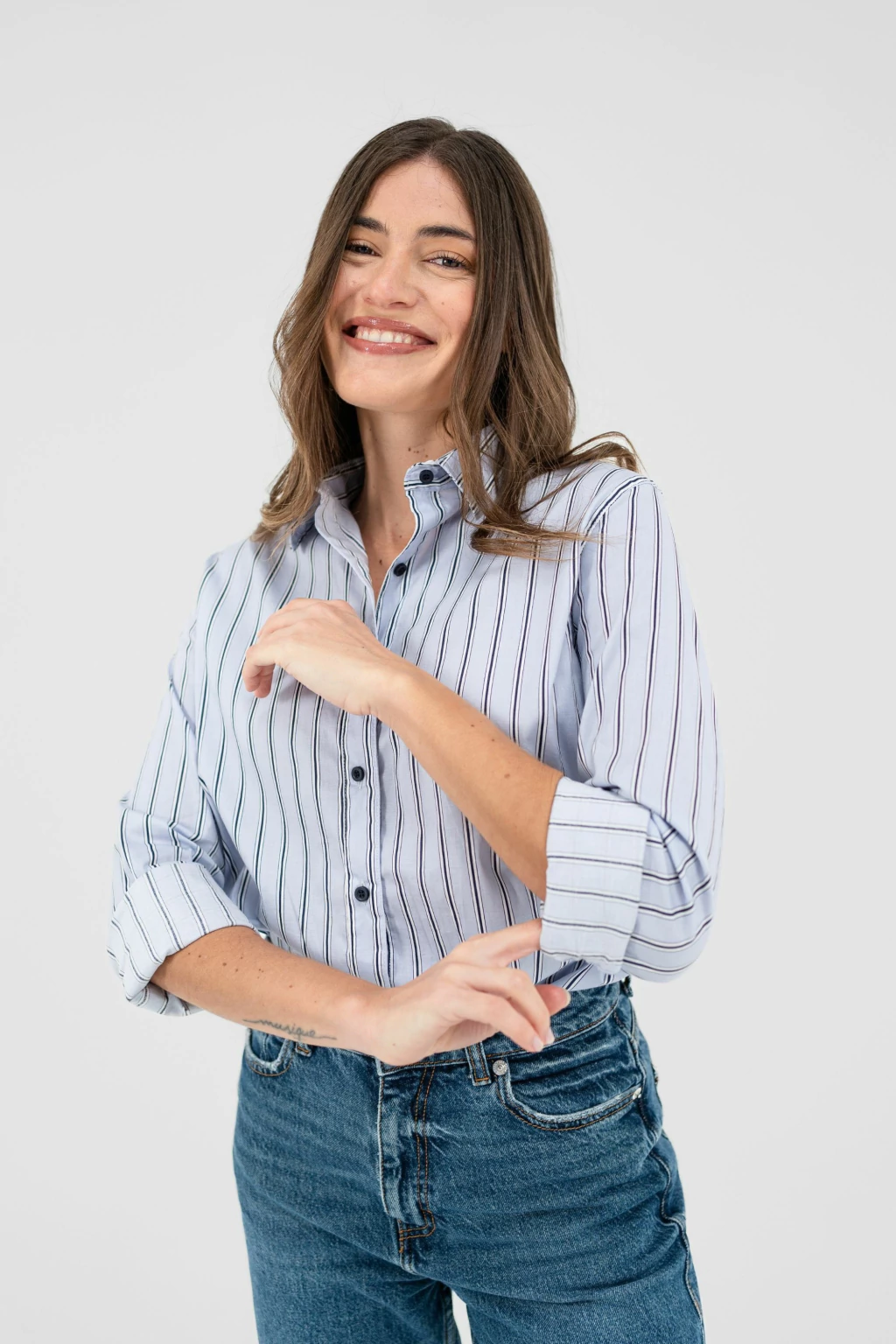 La Camisa Josefina es un nuevo item de la coleccion de LUAM, con diseño en rayas azules sobre fondo celeste. Confeccionada en poplin elastizado 98% algodón, 2% spandex, ofrece suavidad, frescura y la elasticidad justa para garantizar un calce cómodo y favorecedor durante todo el día.