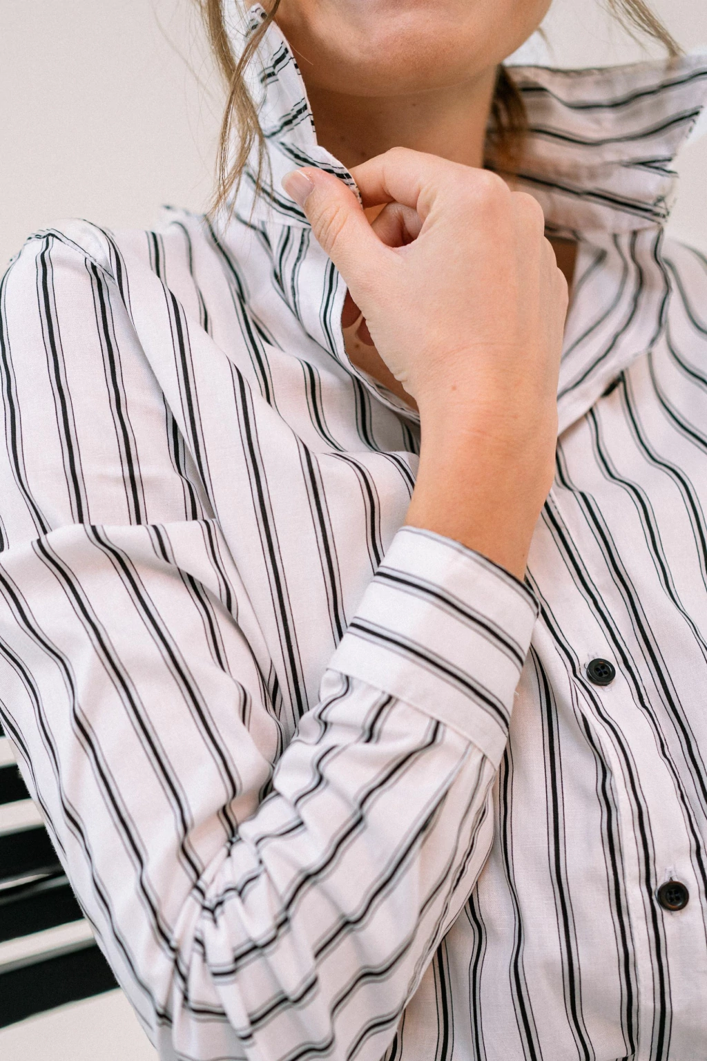 Camisa fondo blanco con rayado negro, clásico y atemporal