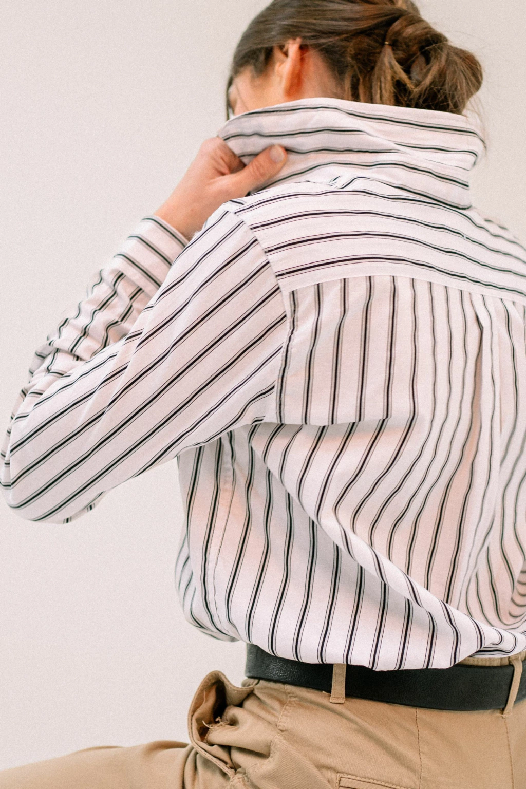 La Camisa Josefina es un nuevo item de la coleccion de LUAM, con diseño en rayas negras sobre fondo blanco. Confeccionada en poplin elastizado 98% algodón, 2% spandex, ofrece suavidad, frescura y la elasticidad justa para garantizar un calce cómodo y favorecedor durante todo el día.